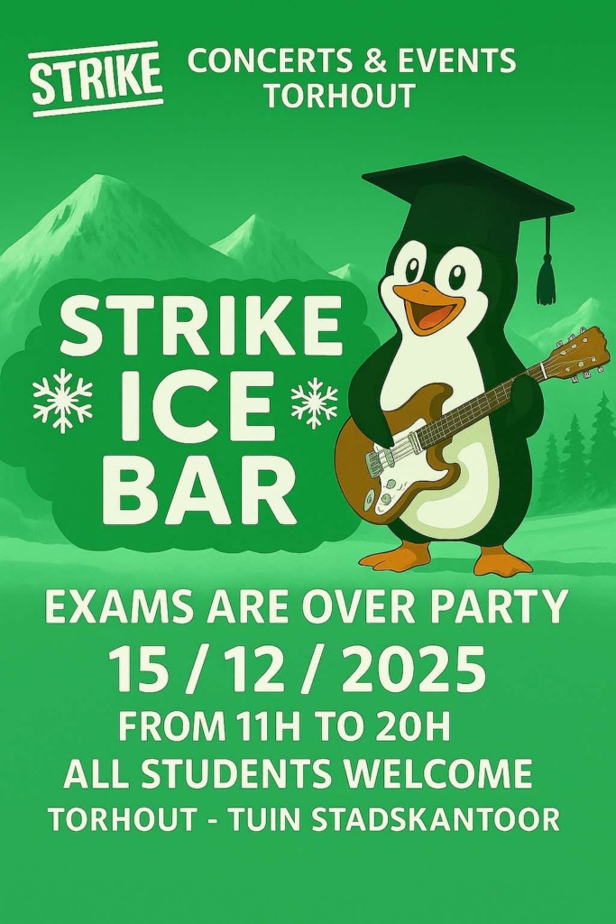 Tijdens de laatste weken van 2025 kan je ons, ondertussen voor de 5de keer, terugvinden in de tuin van het stadskantoor in onze Strike Ice Bar. Kom zeker eens langs om te genieten van enkele lekkere biertjes of hapjes in een mooi winters kader.